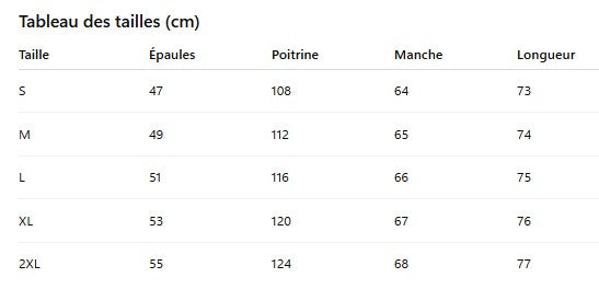Guide des tailles disponible sur la dernière image